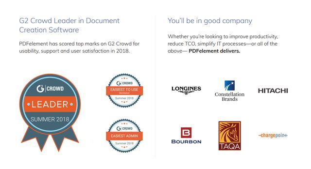 在外洋最著名的B2B软件评测平台G2 Crowd上面,PDFelement获得4.7/5星的好评,是文档建设类软件的向导者,被用户普遍支持;Wondershare则在年头被G2 Crowd评为为最佳软件公司100强、中型市场最佳软件公司50强。作为文档建设向导者,PDFelement希望通过轻松的安排流程、永世允许和无缝标准化来降低用户TCO(总拥有本钱),最大限度地知足企业用户的需求。